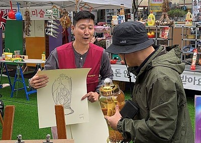 < 인삼주 그림으로 지불 중인 손님 사진:유형주 > 천근성 작가의 ‘만물 미술트럭’ 이라는 공공미술 프로젝트가 요즘 화제가 되고 있다. 만물미술트럭은 돈 대신 그림으로 …
