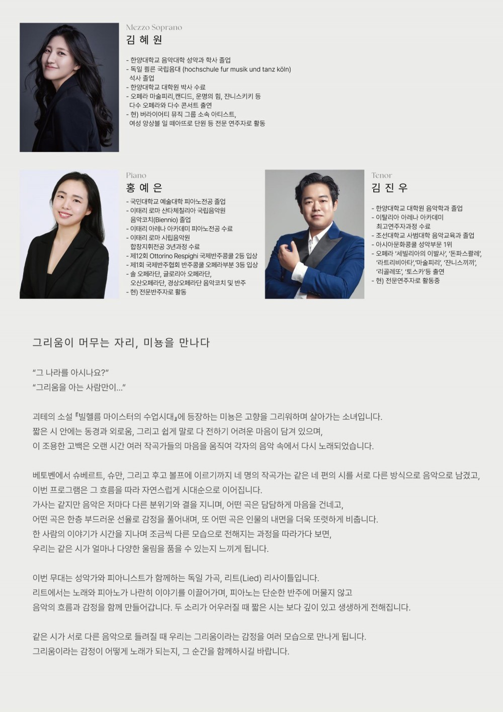 본 공연은 요한 볼프강 폰 괴테(J. W. von Goethe)의 『빌헬름 마이스터의 수업시대』에 등장하는 인물 **미뇽(Mignon)**의 시편 네 편을 중심으로, 서로 다른 작곡가들이 동일한 텍스트를 어떻게 음악적으로 해석했는지를 비교·조명하는 성악 리사이틀이다.