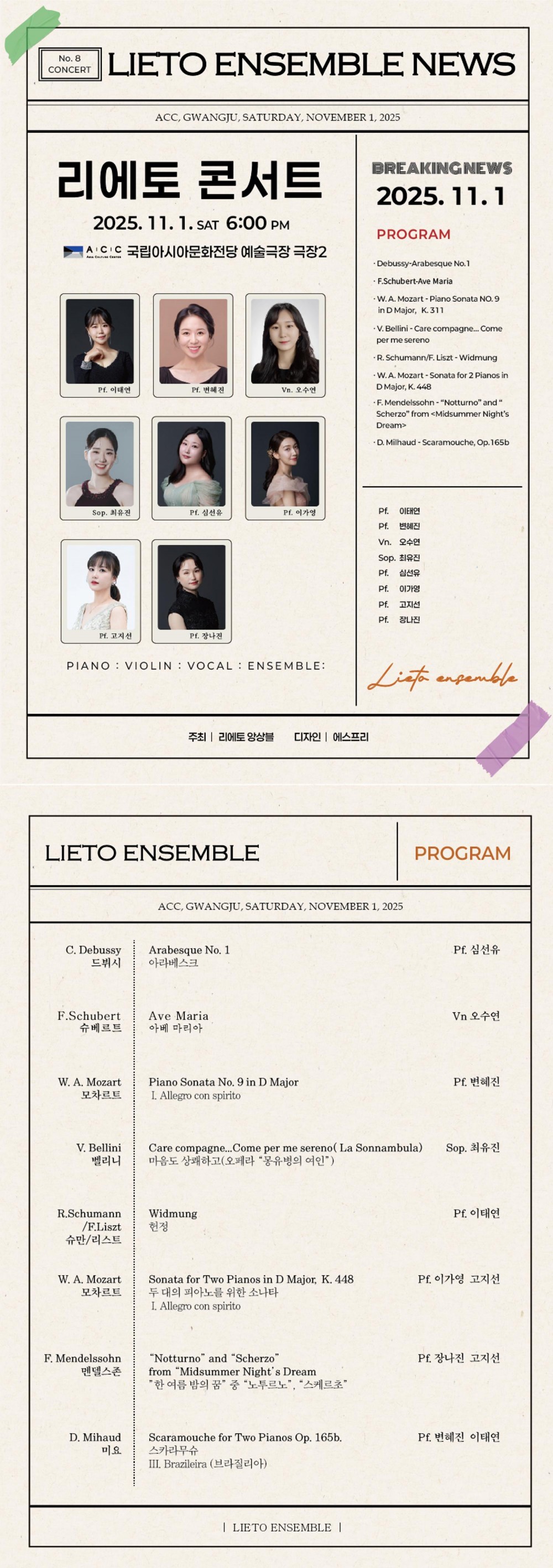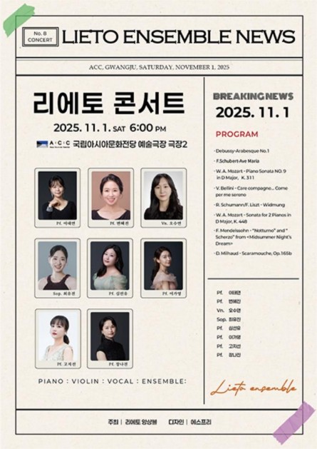 리에토 앙상블(Lieto Ensemble)은 문화 수도 광주광역시를 중심으로 활발하게 활동하는 클래식 연주 단체로, 음악을 통해 기쁨과 감동을 전하고자 결성되었습니다. ‘Lieto’는 이탈리아어로 ‘기쁜’, ‘행복한’을 의미하며, 우리 앙상블은 그처럼 따뜻하고 감성적인 연주를 통해 관객들에게 기쁘고 행복한 순간을 선사하고자 합니다.