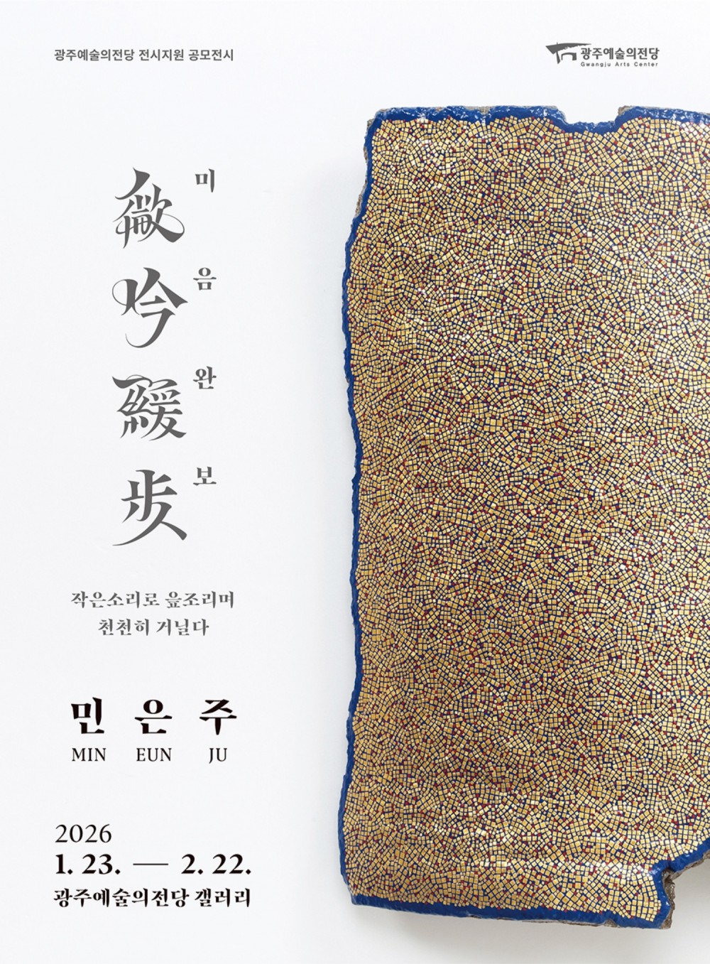 광주예술의전당은 한지 위에 삶과 시간의 궤적을 새겨 넣는 민은주 작가의 개인전 《미음완보 微吟緩步》를 개최한다. 민은주 작가는 세월의 흐름이 고스란히 묻어나는 고재(古材)와 기와를 캔버스 삼아, 그 위에 한지를 입히고 색을 수놓는다. 여덟 번째를 맞이하는 이번 개인전에서는 화려한 색채와 정교한 세공의 미학이 응축된 한지 조형 작품 30여 점을 선보인다.