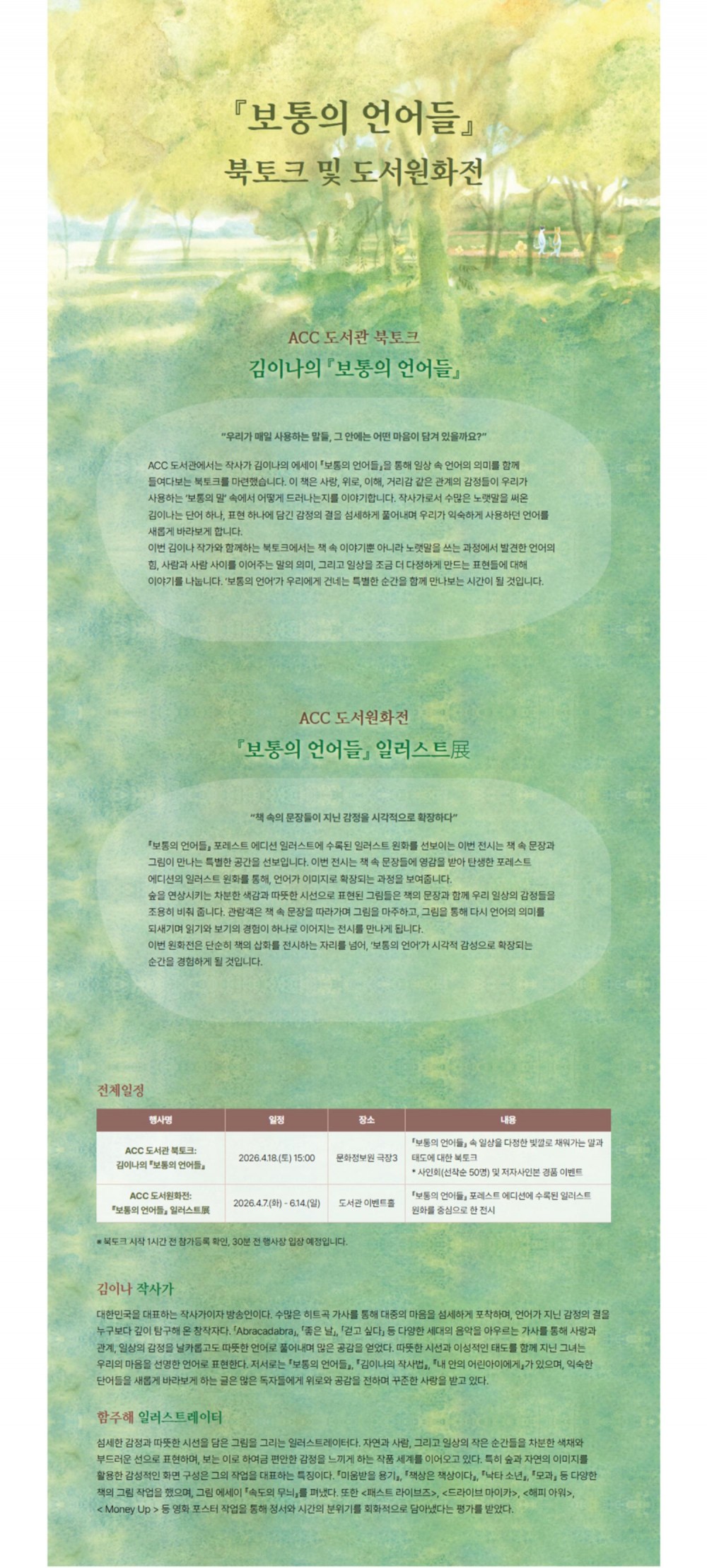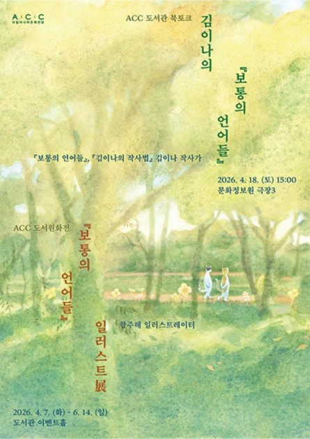 도서관에서는 4월 도서관주간을 맞이하여 〈ACC 도서관 북토크: 김이나의 『보통의 언어들』〉을 개최합니다. 이와 연계하여 〈ACC 도서원화전: 『보통의 언어들』 일러스트展 〉도 선보입니다.