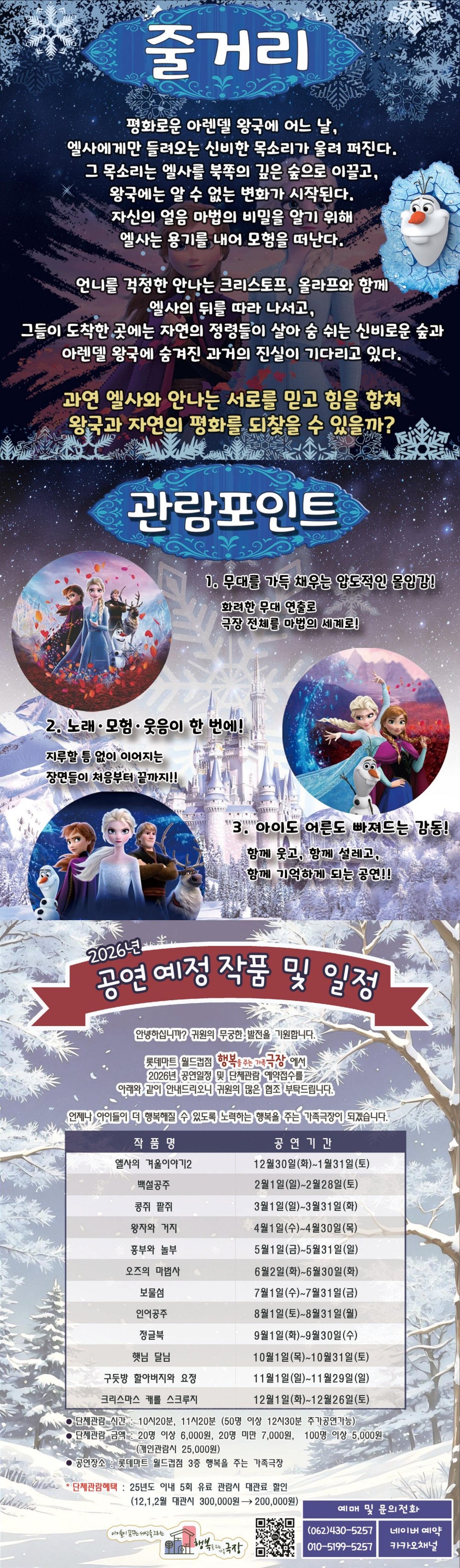 어릴 때 보는 좋은 공연하나가 아이들의 자존감 형성과 희망 가득한 꿈을 그리는데 너무나 좋답니다. 연말 연시, 추원 겨울에 딱 맞는 공연 , 가족뮤지컬 [엘사의 겨울이야기 2]와 함께 아이들과 소중한 추억 만들기 추천합니다. ~~~^^*