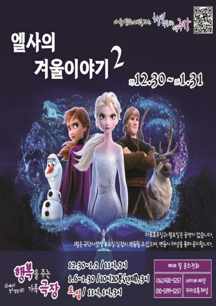 안녕하세요~~ 아이들이 너무나 좋아하는 명작동화, 전래동화들을 어린이들의 눈높이 맞춰서 공연하는 어린이들이 너무나 좋아하는 가족 뮤지컬 전문 공연장 [행복을주는가족극장]입니다. 이상 기온 때문에 춥고 웅크리기 쉬운 겨울이지만 활기차고 행복한 새해를 위해 너무나 재밌고 아이들의 호기심을 자극할 [엘사의 겨울이야기] 보러 오세요. 이번 공연은 엘사의 두 번째 이야기 입니다.