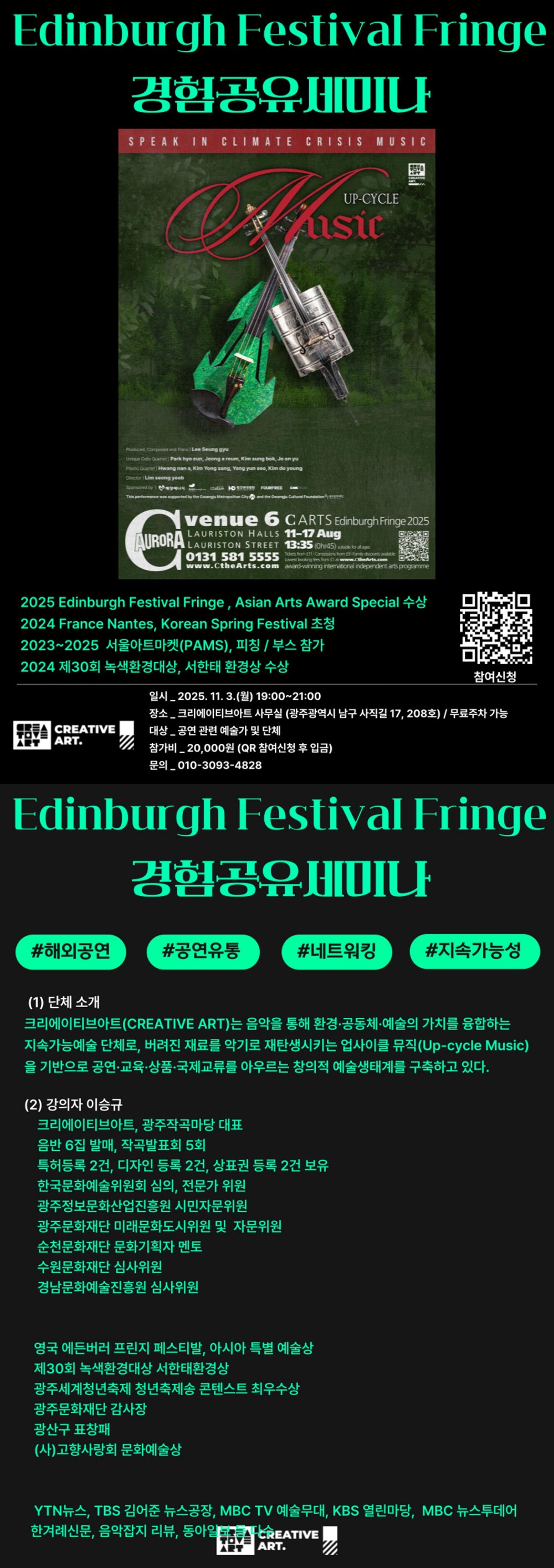 (1) 2025 에든버러 프린지 페스티벌에 참여한 크리에이티브아트의 현장 경험을 공유함으로써 예술가·기획자·창작자들이 해외 예술시장에 대한 감각과 통찰을 함께 나누도록 함.