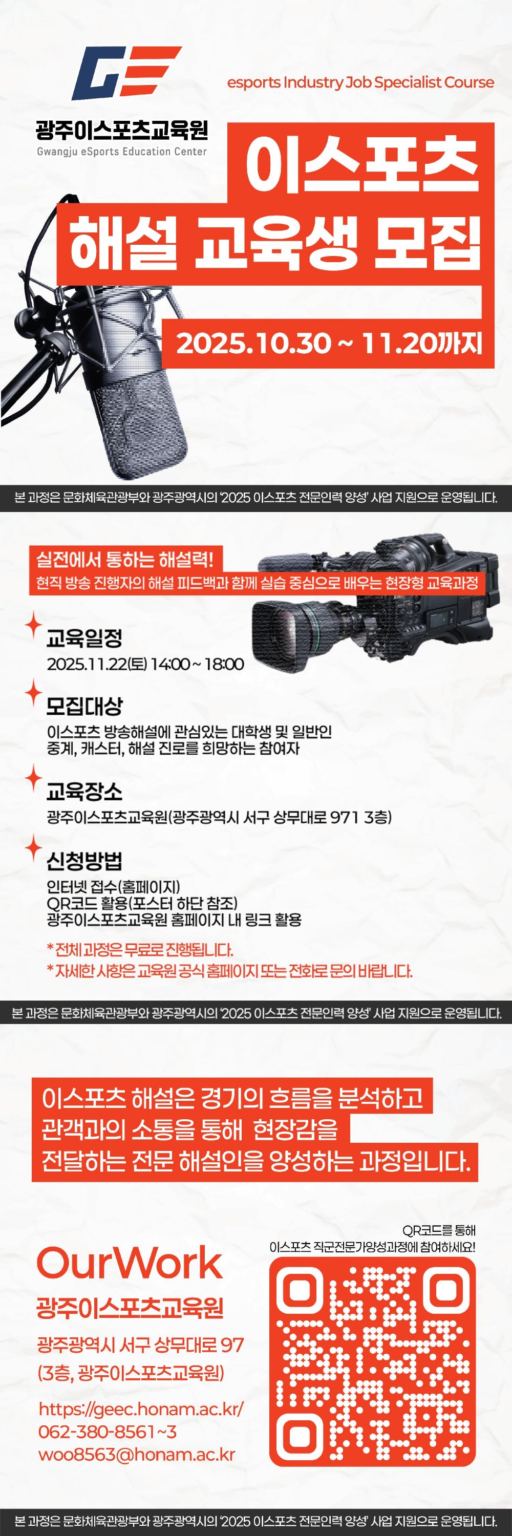 문화체육관광부와 광주광역시의‘2025 이스포츠 전문인력 양성’사업 지원으로 운영되는 광주이스포츠교육원에서 이스포츠산업 활성화와 함께 이스포츠를 이끌어 갈 이스포츠 방송 인재 양성을 위하여 전문 교육과정을 개설하오니 많은 지원 바랍니다.