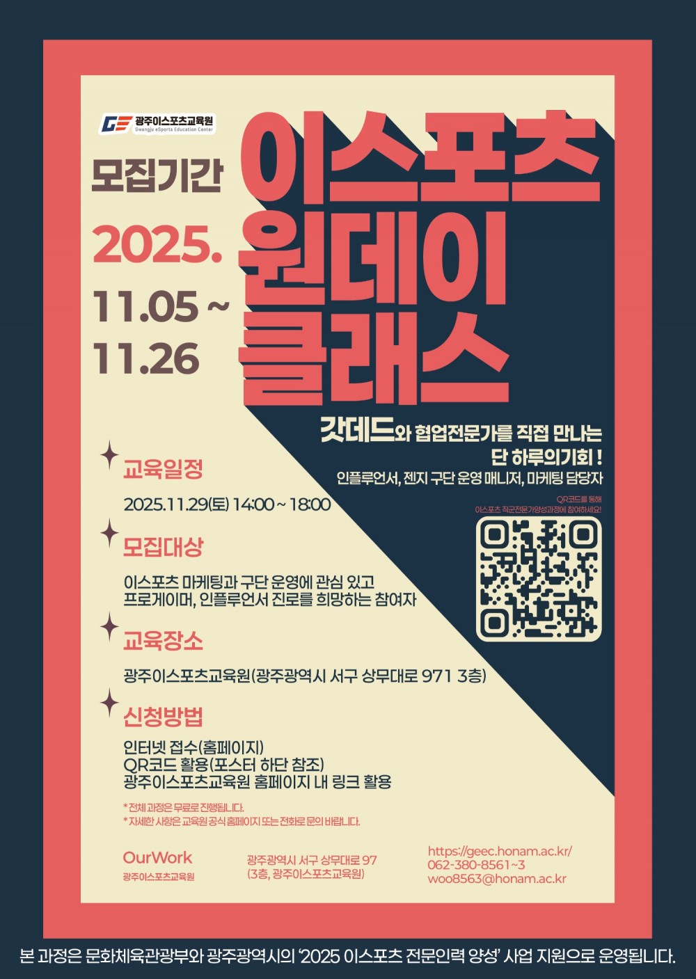 광주이스포츠교육원(원장 정연철)은 이스포츠 산업에 관심 있는 시민과 예비 종사자를 대상으로 ‘이스포츠 원데이 클래스’ 참가자를 모집합니다.