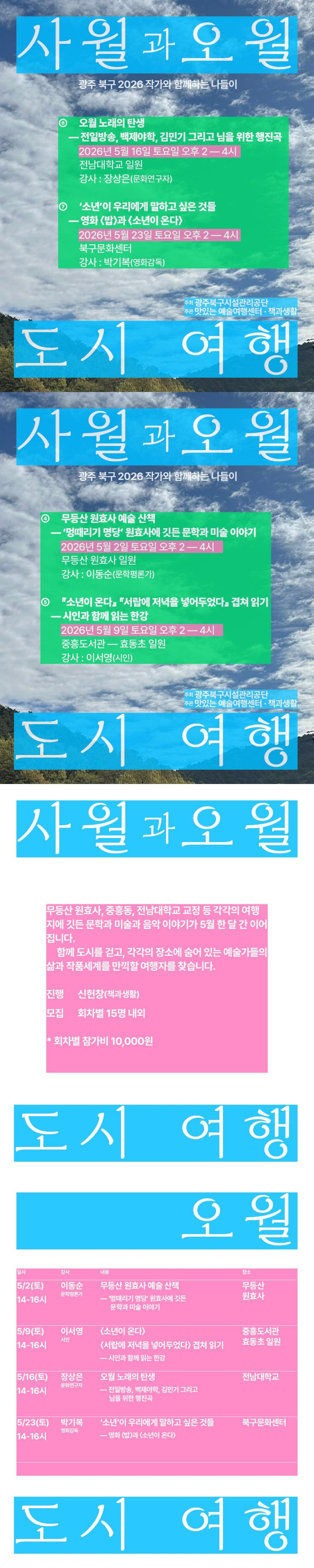 무등산 원효사, 중흥동, 전남대학교 교정 등 각각의 여행지에 깃든 문학과 미술과 음악 이야기가 5월 한 달 간 이어집니다.