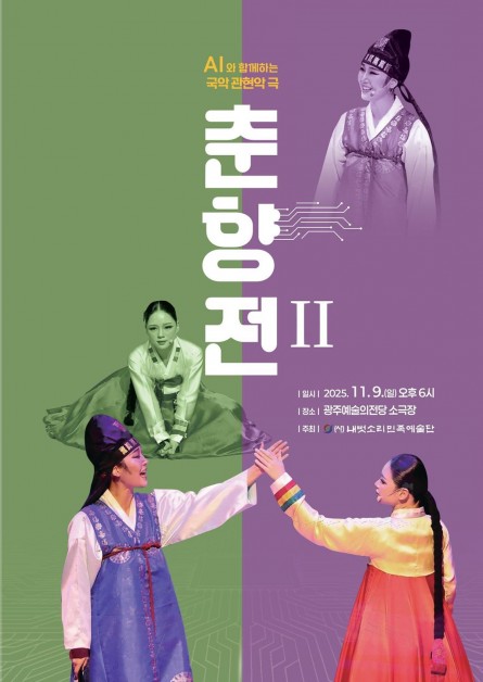 [AI 작곡프로그램을 이용해 만들어진 춘향가의 사랑이야기를 (사)내벗소리민족예술단에서 색다름이 가미된 모습으로 선보입니다. 기존의 창극 형태는 가져가되, AI작곡프로그램을 통해 새롭게 만들어진 음악으로 몽룡과 춘향이의 아름다운 사랑이야기를 표현해보고자 합니다. (사)내벗소리민족예술단에서는 익숙한 악기와 멜로디로도 듣는 이로 하여금 색다르게 느껴질 수 있도록 다양한 시도를 할 예정이며, 전통예술이 나아갈 길과 정체성을 찾기 위한 그 길을 찾아 저희만의 방향을 추구하고 있습니다. 이번에 준비한 국악 관현악극 ‘춘향전’이 시간이 지남에 따라 발전하는 예술에 기여하며, 한 발짝 더 나아가는 의미 있는 공연이 되었으면 합니다.