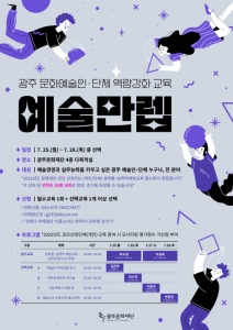 광주문화재단은 올해 보조금 선정 단체와 지역 예술인을 대상으로 역량강화 프로그램 ‘예술만렙’을 진행한다고 24일 밝혔다.광주문화재단은 올해 예술인들의 창작활동을 보장하고 역량을 강화하는데 도움을 줄 ‘간접지원 확대’를 위해 교육, 컨설팅, 간담회 등의 프로그램을 계획하고 있다. 이에 25일부터 4일간 역량강화 프로그램 ‘예술만렙’을 운영한다.특히 올해 광주문화재단 보조금 공모사업에 선정된 단체 및 예술인은 성희롱·성폭력 예방교…