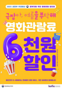 문화체육관광부와 영화진흥위원회는 오는 8일 오전 10시부터 영화 관람료 6천 원 할인권 188만 장을 추가 배포한다고 3일 밝혔다.이번 물량은 지난 7월 25일 배포한 450만 장 가운데 지난 2일까지 사용되지 않은 잔여분을 재배포하는 것이다.할인권은 CGV, 롯데시네마, 메가박스, 씨네큐 등 멀티플렉스 영화관 누리집과 앱을 통해 발급받을 수 있다. 또 독립·예술영화전용관, 작은영화관, 실버영화관 등에서도 제공된다.이번 재배포…
