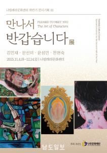 개성 넘치는 캐릭터를 통해 삶의 다양한 얼굴을 마주하는 시간이 나주에서 펼쳐진다.나주문화재단은 오는 12월 14일까지 나빌레라문화센터에서 하반기 기획전시Ⅲ ‘만나서 반갑습니다’ 전(展)을 개최한다.이번 전시는 2025년 나빌레라문화센터의 세 번째 기획전시로 김민재, 문선미, 윤성민, 전현숙 등 서울과 광주에서 활발히 활동 중인 젊은 작가 4인이 참여해 각자의 시선으로 창조한 다채로운 캐릭터 작품을 선보인다.‘만나서 반갑습니다’…