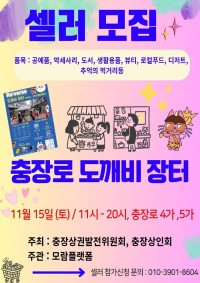 광주 충장로 도깨비장터 플리마켓 셀러 모집 신규 등록 안내 안녕하세요. 플레이광주입니다.광주 충장로 도깨비장터 플리마켓 셀러 모집 신규 등록 안내입니다. 광주 충장로 도깨비장터 플리마켓 셀러 모집 장소충장로4가, 5가 기간2025-11-15 (토) 시간11:00 ~ 20:00 가격20,000원 바로가기 10.22 10:27