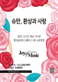 수요콘서트 6회 조이오브뮤직 <슈만, 환상과 사랑> 신규 등록 안내 안녕하세요. 플레이광주입니다.수요콘서트 6회 조이오브뮤직 <슈만, 환상과 사랑> 신규 등록 안내입니다. 수요콘서트 6회 조이오브뮤직 <슈만, 환상과 사랑> 장소빛고을아트스페이스 소공연장 기간2025-12-03 (수) 시간19:30 ~ 20:30 가격5,000원 바로가기 6시간전