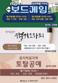 어린이 방학 특강 "꼼지락 공방" 신규 등록 안내 안녕하세요. 플레이광주입니다.어린이 방학 특강 "꼼지락 공방" 신규 등록 안내입니다. 어린이 방학 특강 "꼼지락 공방" 장소서구문화센터 기간2026-01-12 (월) ~ 2026-01-17 (토) 시간12일(월) 13:00, 13:40 13일(화) 14:00 17일(토) 14:00 가격창의력을 키우는 보드게임 ; 5,000원 감성손글씨 캘리그라피 : 5,000원 꼼지락꼼지락 토탈공예 10,000원 관람등급초등학생 바로가기 12.24 11:11