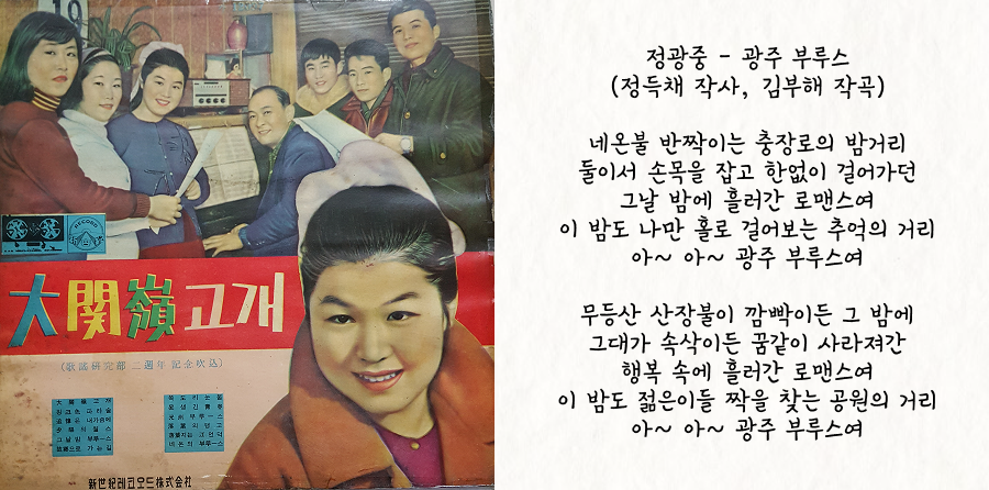 이렇게 10곡이 넘는 노래들이 이 시기에 나왔는데 짧은 시기에 이렇게 많은 노래가 만들어진 경우는 그렇게 흔치 않다. 그중에 정광중이 부른 ‘광주 부루스’를 살펴보자