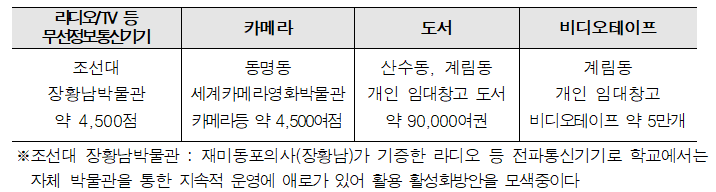 조선대학교 장황남박물관 역시 100여 년 동안의 라디오, TV 등 무선정보통신기기를 모아 놓은 곳으로 재미동포 의사 장황남씨가 학교에 기증하여 전시되고 있는 교내에 있어서 시민 접근성이 떨어지고 방문객들도 많지 않아 아쉬운 실정이다.