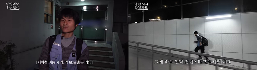 첫 화면부터 강한 인상을 남겼다. 일반적인 러너의 차림이 아니었다. 건설 현장 작업복에 안전화, 안전모, 그리고 물통이 들어 있는 가방까지. 그는 이런 복장으로 지하철 구간을 제외한 모든 출퇴근 거리를 달렸다. 출근도 러닝, 퇴근도 러닝이었다. 왕복 약 8km 거리를 매일 훈련 코스로 삼았다.