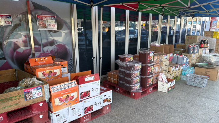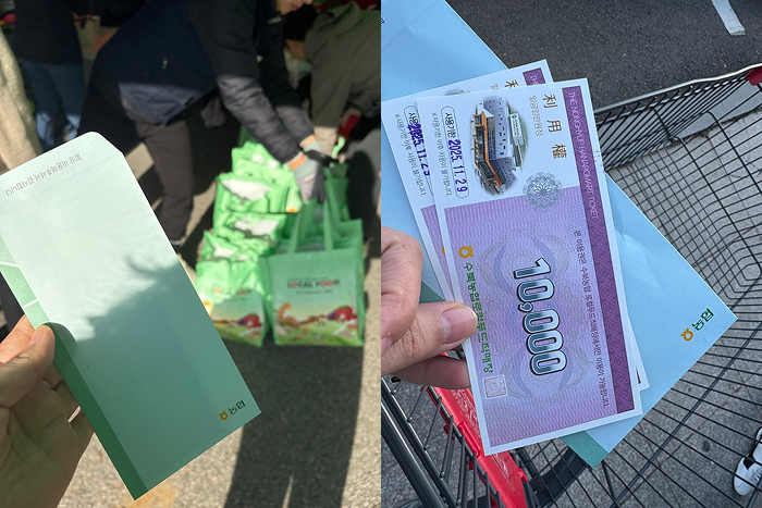 “이 상품권은 2만원권인데요. 오늘까지만 사용하실 수 있어요. 이 상품권 포함 5만원 이상 구입하시면 여기 이 동치미를 드려요. 여기 키트입니다.”