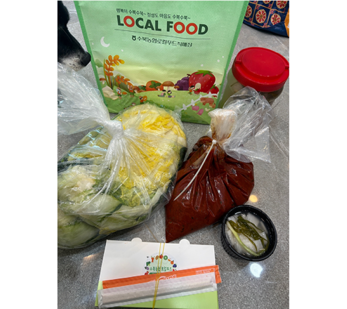 절임배추 5kg+김치양념 2kg+수북농협로컬푸드 타포린백+동치미와 수육도시락+젓가락+마트상품권 = 5만원에 누릴 수 있는 김장체험, 그리고 구매 혜택으로 받은 2.5kg의 동치미까지!