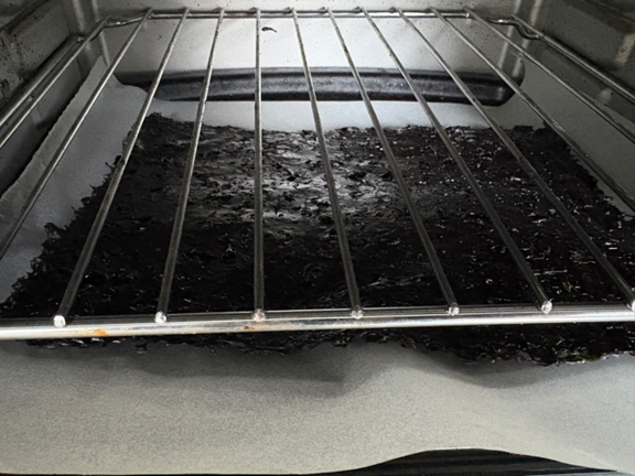(사진출처: 배성현, 김이 날아가지 않도록 에어프라이어 안의 철망을 놓아 공기만 통하게 굽는 것이 포인트, 잘라서 넣어도 되지만 그러면 더 날아간다)